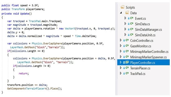 Figure 3. Script PlayerController.cs and list of written programming scripts for running the game. - To prepare and carry out surveys among walking and teleporting players (Section 3.3, Figure 4 and Figure 5).