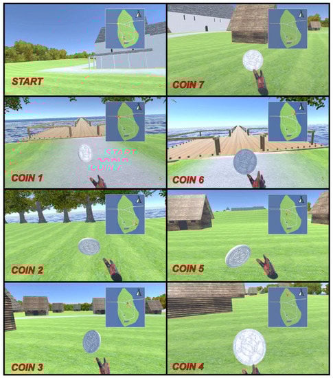 After putting on the goggles, the gamer confirmed that he had moved to the virtual stronghold, could hear sounds and understood the functioning of the controllers, as well as could see his own location on the mini-map. The confirmation by the gamer that he had started to move towards the first coin noticed on the mini-map initiated measuring the total game time (START in Figure 5), and collecting the 7th coin ended measuring the game time (Figure 5).