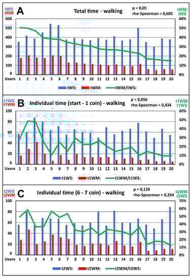 To examine the correlation between the total game time and the mini-map examination time, we used the Spearman correlation test. There is a correlation between the use of the mini-map and the total game time (r = 0.605) (Figure 6A), however, only for the first diagram. This means that the more walking users used the mini-map during the game, the more time they needed for collecting all coins.