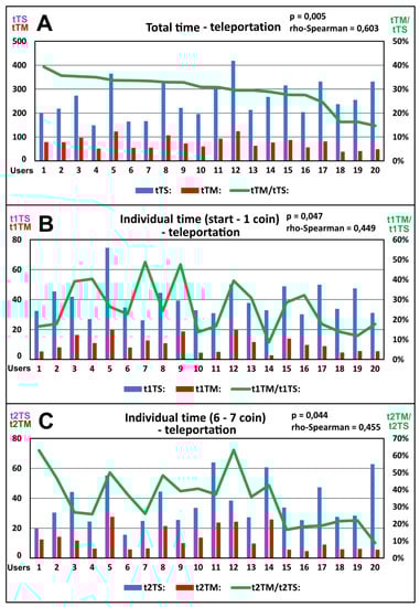The longest mini-map examination time was registered for gamer 12 (123.6 s), and the shortest for gamer 18 (38.8 s) (Table 2 A). For a significant majority of teleporting gamers, the ratio of the total mini-map looking time to the game finishing time was higher than 25% but did not exceed 40%, which means that they spent over ¼ of their time looking at their location and the location of coins. Collecting the first coin for almost half of the game users was quicker when they did not use the mini-map for too long (11 gamers below 25%), whereas collecting the last coin seemed more difficult and required longer examination of the mini-map (14 people above 25%).