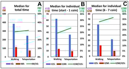 Obtained time data were placed in two tables: walking gamers (Table 1) and teleporting gamers (Table 2). Data in tables were divided into three major data categories: total time, individual time—from the start to the collection of the first coin—and individual time—from the collection of the 6th coin to the collection of the 7th coin. For each category, we distinguished the three most significant data subcategories for each type of movement: time-Walking-Space (tWS)—the total game time for walking gamers, time-Teleportation-Space (tTS)—the total game time for teleporting gamers, time-Walking-Mini-map (tWM)—the mini-map examination time for walking gamers, time-Teleportation-Mini-map (tTM)—the mini-map examination time for teleporting gamers and tWM/tWS and tTM/tTS, i.e., the ratio in percent. To present the data from Table 1 and Table 2, we used column charts and a line chart (Figure 6 and Figure 7).
