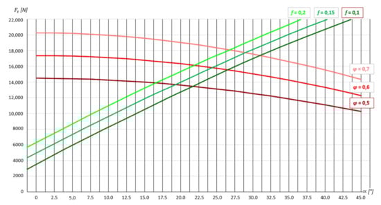 - The variant of the best rated traversability: f = 0.1 and φ = 0.7—maximum reachable gradient is up to 30.89° and the limit for hardly passable terrain is 16.17°.