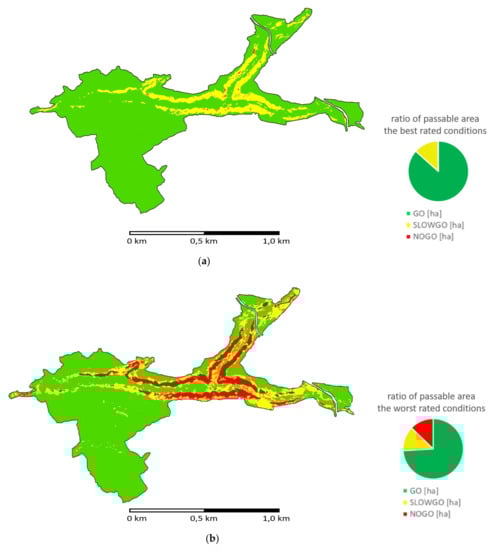 - The variant of the worst rated traversability: f = 0.2 and φ = 0.5—GO 74.0%, SLOW GO 13.2%, NO GO 12.8%.
