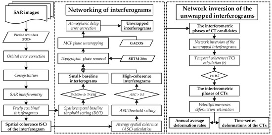 To acquire abundant deformation measurements in the saline soil area, an appropriate interferogram network is proposed in this section. The improved TS-InSAR procedures including interferometric coherence analysis, interferogram networking, network inversion and the CT selection, are described in detail. The data processing flow adopted in this paper is shown in Figure 1. It should be noted that, all the interferograms are unwrapped by the minimum cost flow (MCF) method before the interferogram network inversion.