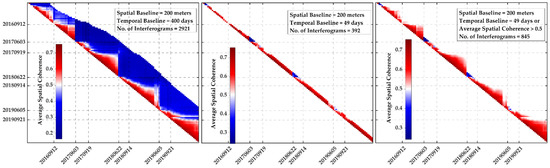 There is almost no vegetation cover in the study area, which is bare sandy or mucous saline soil, and the interferometric coherence is high in a short time, as show in Figure 5. High-quality interferometric pairs obtained by temporal baseline threshold are used for forming a interferogram network. Furthermore, in terms of phase consistency, we first set the temporal baseline of 49 days and make sure each SAR image date is combined with at least two others for a better phase closure, which is the same as case 2 in Figure 2. Then the network of a conventional SBAS-InSAR is formed by 392 interferograms, as shown in the middle subplot of Figure 5. However, because of the missing SAR images in some periods, there are still many sequential isolated interferograms for the SBAS-InSAR, this will cause the inaccurate result and accumulated errors propagation in the subsequent calculation procedures.