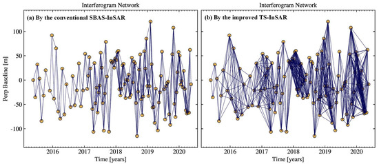 The spatiotemporal baselines of the interferograms for the conventional SBAS-InSAR and the improved TS-InSAR. The time span is from 21 May 2015 to 18 May 2020, and the perpendicular baselines of all the interferograms are between −150 m to 150 m. The threshold of the temporal baseline is 49 days for the conventional SBAS-InSAR, and on that basis, the interferograms with the ASC higher than 0.5 are added in the network for the improved TS-InSAR.