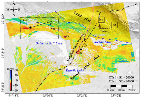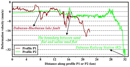 For further analyzing the complicated characteristics of the saline soil under different geological conditions or humanistic environment, we depicted the profiles of the deformation velocity in area (a) and area (b), respectively. As shown in Figure 13, we can know from the profile P1 of the deformation velocity that the DHLF is an obvious boundary of different deformation characteristics. Similarly, the profile P2 shows that there is an obvious boundary of deformation between sand flat and saline mud flat. In the sand flat, the deformation velocity of the selected CTs are close to 0 mm/a, while −4 mm/a to −37 mm/a in the saline mud flat. These different characteristics of deformation indicate that the foundation of the sand flat is more stable than that of the saline mud flat in the Qaidam Basin.