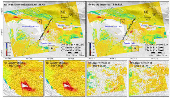 In order to compare the results derived from the conventional SBAS-InSAR and the improved TS-InSAR, we firstly calculate the amounts of CTs for both of them, as shown in Figure 8. The results show that there are 5,842,290 CTs for the conventional SBAS-InSAR, while 5,937,319 CTs for the improved TS-InSAR. There are almost 0.1 million CTs increased by the improved TS-InSAR method. These newly added CTs are distributed in the saline soil area with relatively low coherence or significant seasonal deformation. For example, we select the effective observations in two different kinds of areas for further analyzation, they are A and B respectively. In the area A, as shown in the lower-left subplots of Figure 8, the severe subsidence is mainly caused by the artificial exploitation of brine, and the decorrelation is result from the large gradient deformations. The estimation results of the deformation show that the amount of effective observation points increases in the center of the decorrelation area. In addition, the area B is a natural environmental site, and the deformation of saline soil is influenced by the seasonal change of the surface runoffs, precipitation, etc. The seasonal decorrelation is significant in such a saline soil area. However, the effective observations after the processing of the improved TS-InSAR method are more than that of the conventional SBAS-InSAR.