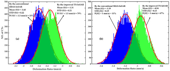 The two subplots are the histogram statistics of the deformation velocity, (a) is the results derived by the conventional SBAS-InSAR and the improved TS-InSAR in area S1, respectively, and (b) is the results derived by them in area S2.