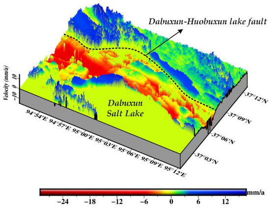 3D view of the deformation velocity in area (a) which is depicted in Figure 7, the black dotted line in the middle indicates the Dabuxun-Huobuxun lake fault.