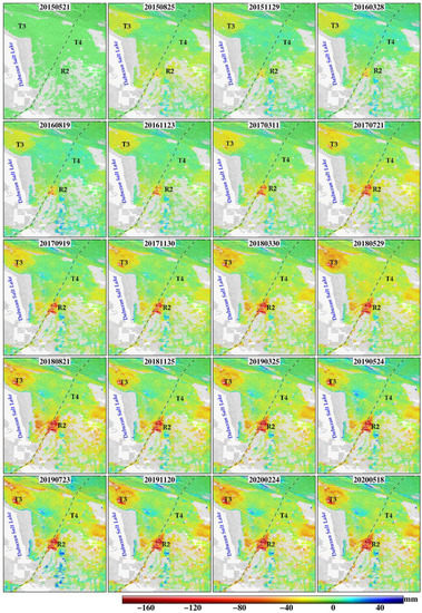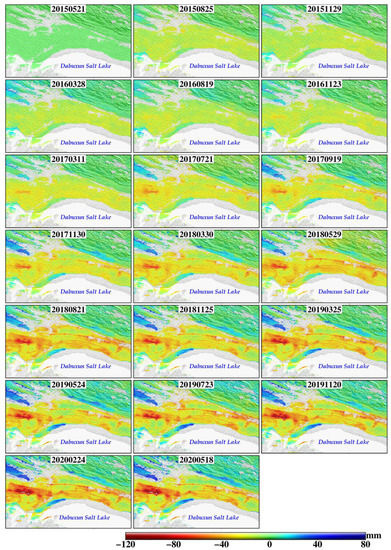 The accumulated deformation maps of area (a) from May, 2015 to May, 2020, each subplot is depicted with about 3 months’ increments from the deformation results of TS-InSAR.