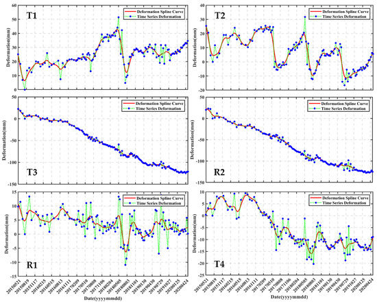 The time-series deformation of the representative CTs, the blue dots are the estimated results of the time-series deformation and the red line indicates the fitting result of the deformation spline curve.