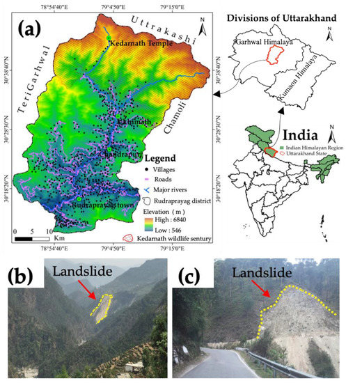 The study area (a) location map of Rudraprayag district of Uttarakhand state in the Indian Himalayan Region; and field photographs of landslide occurrences (2016/04/03) in the study area; (b) tree lost by landslide; and (c) road damaged by landslide.