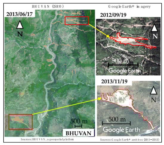 The multi-temporal landslide inventory is essential for understanding the relationship between past landslide occurrences and their causative factors. In this study, we applied the weights of evidence (WoE) method, which is based upon the assumption that the past is key to the future; thus, the past landslide data are necessary [123,124]. The previous studies emphasized that the point location data of landslides could ignore the size or magnitude of landslides and might yield a biased result for landslide susceptibility mapping and assessment [124]. Therefore, to reduce these uncertainties, the landslide as a polygon was used in this study. The multi-temporal landslide inventory dating was prepared through multiple data sources, i.e., BHUVAN (Indian earth observation visualization), a web-based geospatial platform developed by the Indian Space Research Organization (ISRO), government reports, and Google Earth® imagery. Thus, taking advantage of web-based platforms (BHUVAN and Google Earth®), the government reports, and previous studies, we prepared multiple-temporal landslide inventory data from 2011 to 2013, along with a ground truth survey [125]. These landslides were triggered by heavy rainfall, flash flood, and cloudburst in the Rudraprayag district. At first, the landslide’s location was extracted as a reference from the BHUVAN, and the government report [115,116,117]. Afterward, these landslide’s location data were imported into Google Earth®, and then the landslides were delineated using high-resolution Google Earth® imagery to prepare a multi-temporal landslide inventory in ArcGIS. Thus, we were able to use the Google Earth® engine to extract 293 landslides as polygons from 2011 to 2013. Later, the landslide polygons were converted to raster using the vector to raster conversion tool in ArcGIS. Afterward, all landslide polygons were re-sampled in the same pixel size with the standard UTM 44N zone. Figure 2 shows an example of landslides identification using the BHUVAN and Google Earth® engine.