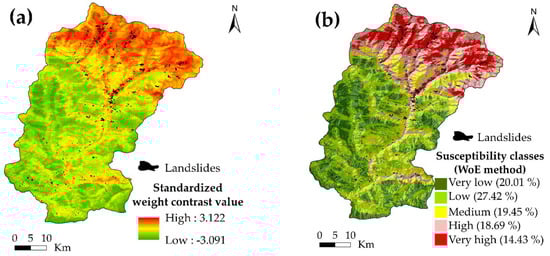 The landslide susceptibility map was obtained using the WoE method. Figure 5a shows the overall standardized weight contrast value, i.e., positive weight contrast and negative weight contrast. Figure 5b shows the final landslide susceptibility maps of the Rudraprayag district. The landslide susceptibility was divided into five classes by the natural break method using ArcGIS. Figure 5b shows that 14.43% of the area falls under the very high susceptibility class, 18.69% of the area falls under the high susceptibility class, while 19.45%, 27.42%, and 20.01% of the area belong to medium, low, and very low susceptibility classes, respectively.