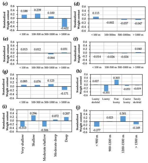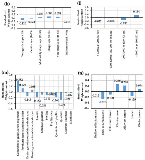 The graphs of landslide causative factors and their corresponding standardized weight contract value: (a) land use/cover; (b) slope aspect; (c) distance to streams; (d) distance to roads; (e) distance to thrust; and (f) distance to lineaments; (g) distance to faults; (h) soil type; (i) slope depth; (j) relative relief; (k) slope angle; and (l) altitude zone based on rainfall; (m) lithology; and (n) geomorphology.