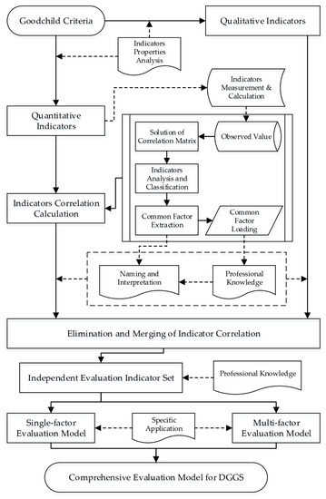 The correlations among the quantitative indicators were calculated by factor analysis. Indicators with incompatible and overlapping information were eliminated or merged. The internal dependency relationship was then obtained by naming and interpreting the indicator with expert knowledge, and independent factors were extracted to construct a revised evaluation indicator system. The process is shown in Figure 1, and the steps are as follows: