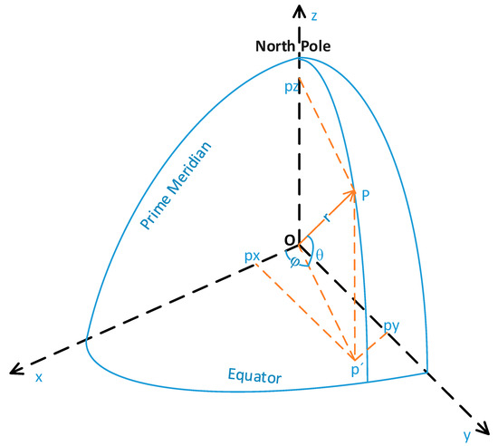 The measurement methods of the quantitative indicators were designed first. The coordinates of vertices of the grid cell are denoted as . In spherical coordinates, a point is represented as in radians (see Figure 2), where is latitude () and is longitude (). Conversion from the coordinates to the Cartesian coordinates of any point on the Earth were calculated as Formula (1) [41]
