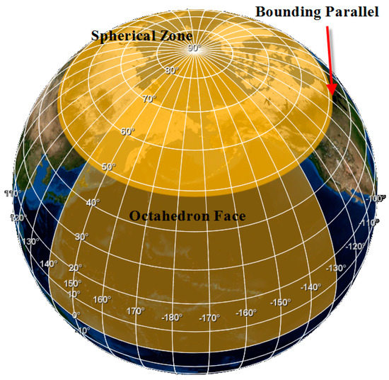 - White, D.; Kimerling, A.J.; Sahr, K.; Song, L. Comparing Area and Shape Distortion on Polyhedral-Based Recursive Partitions of the Sphere. Int. J. Geogr. Inf. Sci. 1998, 12, 805–827. [Google Scholar] [CrossRef]