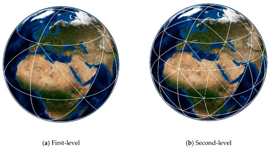 A Discrete Global Grid (DGG) is a spatial structure based on a spherical (or ellipsoidal) surface that can be subdivided infinitely without changing shape and simulates the shape of the Earth’s surface [1,2]. The various resolution grids form a hierarchy with a high degree of regularity and strict transformation relationships among the DGGs [3]. This provides a unified expression mode that can fuse unevenly distributed geographical phenomena at different scales [4,5]. DGGs have been widely used in large-scale spatial data management, decision making, and simulation analysis. For example, they have been used in the spatial data organization, indexing, analysis, and visualization [6,7,8,9]; global environmental and soil monitoring models [10,11]; atmospheric numerical simulations and visualizations [12]; ocean numerical simulations and visualizations [13]; place names management or gazetteers [14]; big Earth data observations [12,15]; modeling of offset regions around the locations of Internet of Things (IoT) devices [16]; cartographic generalization and pattern recognition for choropleth map-making [17]; the Unmanned Aerial Vehicle (UAV) data integration and sharing [18]; the Modifiable Areal Unit Problem (MAUP) [19]; especially in digital Earth [5,16,20,21,22], and so on.