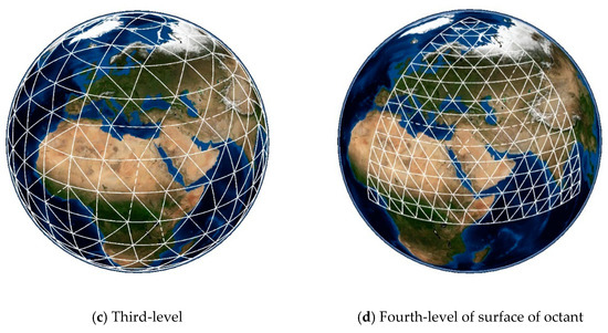This paper selected a typical DGG model—QTM [33] (see Figure 6)—as an example to study the correlation of the quantitative indicators of the Goodchild Criteria. Because the spherical triangle is the most basic grid unit of many global discrete grid systems, it is simple and can be combined into other shapes of grid systems such as spherical diamonds, pentagons, and hexagons, depending on the needs [22,46]. QTM is a spherical triangular grid structure based on an octahedron. In the initial partition, its vertices occupy the main points of the sphere (including the poles), while the edges coincide with the equator, the Prime Meridian, and/or the or 180° or 270° Meridians. It is easy to determine which face of the spherical octahedron a point is on, and it is easy to transform the coordinates with the latitude and longitude grid [33]. The points are obtained using the Formula (1).