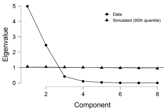 The scree plot shows a steep slope at the beginning of the curve, corresponding to the first two components (Figure 7), which play a strong role in describing the original information; the end of the curve flattens, indicating that the effect of the other components is weak. Therefore, we selected the first two eigenvalues to evaluate the common factors.