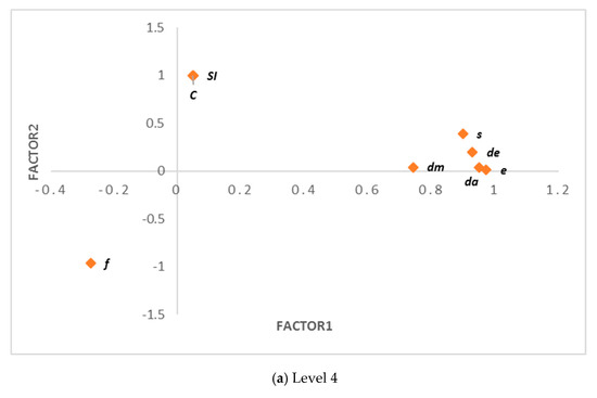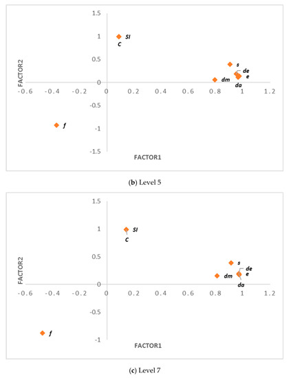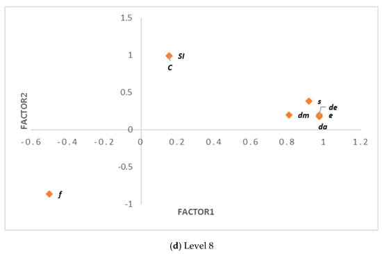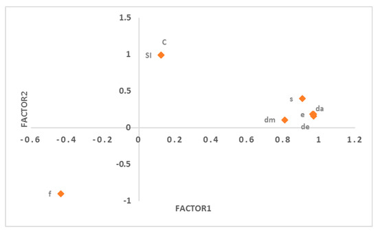 For the quantitative evaluation of the indicators of the Goodchild Criteria, this paper finds through experiments that when solving the eigenvalues of the relationship matrix, the cumulative contribution value of the two components reaches 93.004% (i.e., greater than 85%). Therefore, it can be considered that the information expressed by the two evaluation factors is enough to evaluate the DGG model, and the loading of each evaluation indicator on the two factors can be calculated. From the loading matrix (Table 4 and Figure 8), it can be found that the common factor 1 mainly covers four indicators and five variables such as area (s), edge (e), midpoints (dm), center-point spacing (de, da). These indicator variables are all related to the area of the cell, and the common factor 1 can be called the Area Factor. Common factor 2 mainly covers three indicators and variables such as shape (SI), compactness (C), and structure (f). These variables are all related to the outline or shape of the grid cell, and the common factor 2 can be called the Shape Factor. The specific analysis is as follows: