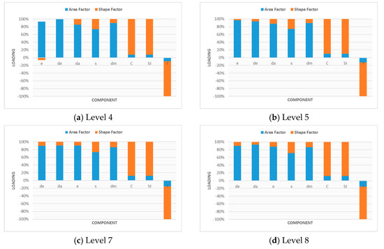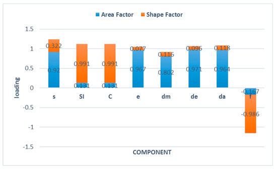 Indicators allocation and interpretation. The evaluation indicators are related to two independent common factors (Table 6 and Figure 8). Common factor 1 mainly covers four indicators and five variables (area (s), edge (e), midpoints (dm), center-point spacing (de, da)), which are all related to the cell area and thus can be called the Area Factor. Common factor 2 mainly covers three indicators and variables (shape (SI), compactness (C), and structure (f)), which are all related to the shape of the grid cell, and thus can be called the Shape Factor. The loadings of Area Factor and Shape Factor to the indicator variables are shown in Figure 9.