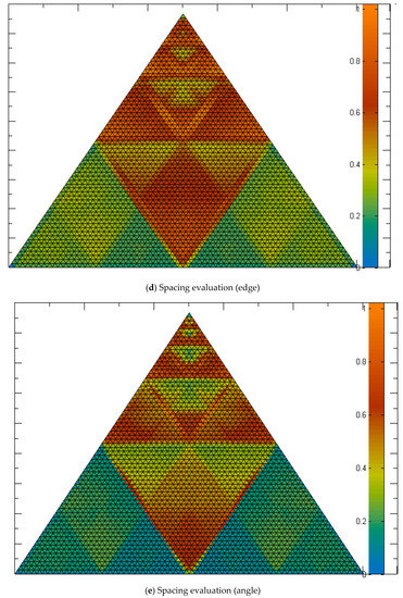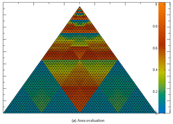 Figure 12 shows the Area Factor evaluation results (area, edge, midpoints, the center-point spacing indicator with an adjacent edge, and center-point spacing indicator with adjacent vertices). The structure of the distribution diagram of each indicator is similar, but the distribution of the values is different, indicating different degrees of correlation.