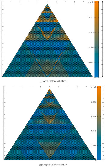 Structure, whether it is regular or arbitrary, is an important attribute of the grid model, and it is the basis for obtaining geocoding and run efficient algorithms of the grid [28]. Because regularity is not easy to quantify, the irregularity indicator used to measure patches in landscape ecology is introduced, i.e., the fractal dimension [44]. In normal circumstances, there would be , and . For the sake of simplicity, let the parameter be 0.0. Therefore, the fractal dimension is: