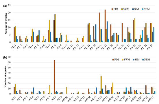 Due to the location of the country as an island in the equatorial and tropical zones, the Sri Lankan climate experiences vibrant variations during the 12 months in a year. According to the rainfall profile of Sri Lanka, there are four climate seasons, which classified as two monsoon seasons and two inter-monsoon seasons. The two monsoon seasons are named SWM-southwest monsoon season (May–September) and NEM-northeast monsoon season (December–February), whereas the two inter-monsoon seasons are distinguished as FIM-first inter-monsoon season (March–April) and SIM-second inter-monsoon season (October–November). Table 1 shows the recorded number of deaths, injuries, destroyed houses, and damaged houses due to lightning activity in each AD during all four climate seasons, from 1974 to 2019. Figure 2 shows the distribution of the deaths and injuries due to lightning accidents in Sri Lanka during all four climate seasons, from 1974 to 2019. Figure 3 shows the distribution of damaged houses and destroyed houses due to lightning accidents in Sri Lanka during all four climate seasons, from 1974 to 2019. Stated below are the important observations that were extracted by referring to Figure 2 and Figure 3.