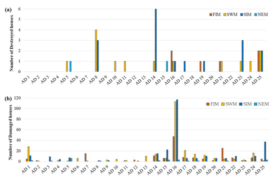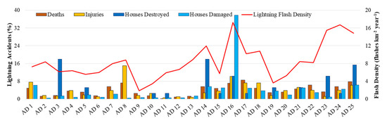 During the second inter-monsoon season, from 1974 to 2019, 14 deaths and 12 deaths were recorded in AD 17 and AD 15, respectively, and the maximum number of lightning injuries was recorded in AD 21, with a maximum record of 13 injuries followed by 12 injuries in AD 4 and AD15. The maximum number of damaged and destroyed houses due to lightning accidents in this season was recorded in AD 16 and AD 14, with 117 damaged houses and 6 destroyed houses, respectively. Moreover, AD 2, AD 6, AD 7, AD 10, AD 11, and AD 13 had no recorded incidents regarding destroyed and damaged houses due to lightning accidents. A maximum number of 10 deaths, and a second maximum of eight deaths were recorded in AD 25 and AD 23, respectively, during the northeast monsoon season, with a maximum record of 12 injuries recorded in AD 20. The maximum number of six damaged houses due to lightning accidents was recorded in AD 5 in this season. Meanwhile, only two administrative districts (AD 5 and AD 15) recorded destroyed houses in this season. In AD 2, AD 4, AD 9, AD 11, AD 12, AD 13, and AD 19, there were no recorded incidents regarding lightning accidents for people or houses in the northeast monsoon season during the considered period.