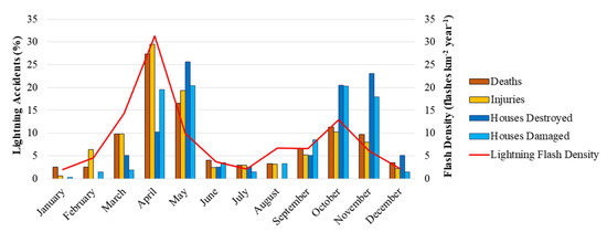 Previous studies have shown that, in Sri Lanka, the maximum number of lightning activities occur in April, followed by the months of March, May, September, and October, which have more accidents than the other months in the year [7,10,11,12]. Table 2 shows the monthly variation of the number of deaths, injuries, destroyed houses, and damaged houses due to lightning accidents in Sri Lanka from 1974 to 2019.