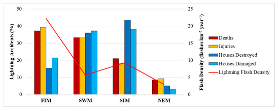 Similarly, Figure 11 shows the spatial variation of the lightning flash density in Sri Lanka, and the recorded number of total lightning accidents in the percentage-wise distribution for all four climate seasons. Even though a higher lightning flash density dominated in the first inter-monsoon season, together with a significant record of lightning accidents compared to the other three climate seasons, lightning accidents were recorded throughout the country in all four climate seasons. Figure 12 shows the spatial variation of the lightning flash density in Sri Lanka, and the recorded number of total deaths and injuries in the percentage-wise distribution during all 12 months, whereas Figure 13 shows the spatial variation of the lightning flash density in Sri Lanka and the recorded number of damaged properties. The statistical details of the lightning flash density in Sri Lanka—extracted from the aforementioned raster maps using zonal statistics—are tabulated in Appendix A: Table A3, Table A4, Table A5, and Table A6. As stated in Table A3, the annual average lightning flash density of Sri Lanka is 8.26 flashes km−2 year−1 (maximum = 28.05, minimum = 0.84, and standard deviation = 3.88). As stated in Table A4, the highest lightning flash density of Sri Lanka is in April (average = 31.33 flashes km−2 year−1, maximum = 146.76, minimum = 0.02, and standard deviation = 23.31), whereas January recorded the minimum (average = 2.00 flashes km−2 year−1, maximum = 22.78, minimum = 0.00, and standard deviation = 3.84). As stated in Table A5, with regards to the climate seasons, the highest lightning flash density of Sri Lanka was reported in the first inter-monsoon season (average = 22.25 flashes km-2 year-1, maximum = 85.88, minimum = 0.79, and standard deviation = 15.09). Moreover, as stated in Table A6, the Kegalle district recorded the highest lightning flash density (average = 17.27 flashes km−2 year−1, maximum = 27.19, minimum = 7.53, and standard deviation = 3.39), whereas the Jaffna district recorded the lowest (average = 1.87 flashes km−2 year−1, maximum = 3.01, minimum = 0.84, and standard deviation = 0.45). The variations of the average lightning flash densities in terms of months, districts, and seasons are shown in Figure 4, Figure 5, and Figure 7, respectively, together with all of the recorded lightning accidents.