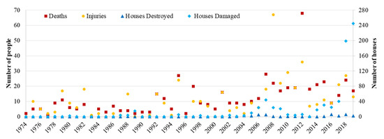 Figure 7 shows the annual variation of the lightning accidents in Sri Lanka, from 1974 to 2019. According to Figure 7, the maximum number of 68 people died due to lightning accidents in 2012, and the maximum number of 67 people were injured due to lightning accidents in 2008. A maximum of six houses were destroyed due to lightning activity in 2016 and 2018. Furthermore, a maximum of 245 houses were damaged due to lightning activity in 2019, and the second maximum of 199 damaged houses was recorded in 2018 within the considered period.