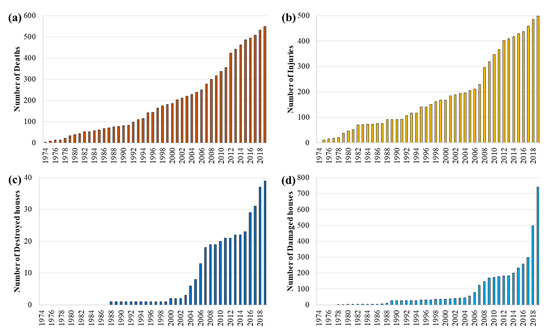 Cumulative lightning accidents in Sri Lanka, from 1974 to 2019: (a) number of deaths; (b) number of injuries; (c) number of destroyed houses; (d) number of damaged houses.