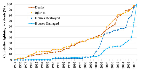 Cumulative lightning accidents (in %) in Sri Lanka, from 1974 to 2019.