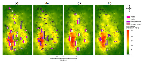 Distribution of the lightning accidents in the administrative districts of Sri Lanka, from 1974 to 2019: (a) deaths due to lightning strikes, (b) injuries due to lightning strikes, (c) destroyed houses due to lightning strikes, and (d) damaged houses due to lightning strikes.