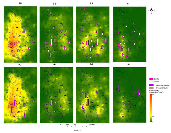 Variation of the lightning flash density with the recorded lightning accidents (in %) in Sri Lanka, from 1974 to 2019, for all four climate seasons, presented district-wise: (a) FIM deaths and injuries, (b) SWM deaths and injuries, (c) SIM deaths and injuries, (d) NEM deaths and injuries, (e) FIM destroyed and damaged houses, (f) SWM destroyed and damaged houses, (g) SIM destroyed and damaged houses, and (h) NEM destroyed and damaged houses.