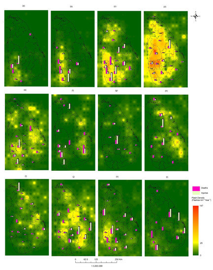 Furthermore, Sri Lanka is experiencing several types of natural hazards, such as floods, strong winds, drought, heavy rain, and lightning, etc. [15,16]. As has been reported in previous studies, as a tropical country, hazards due to lightning have been identified as one of the dominant natural hazards in Sri Lanka [6,7,10,11,12,14,15,16]. However, due to a lack of detailed information on the distribution of lightning accidents in Sri Lanka, estimating the lightning hazard levels and performing a risk assessment in Sri Lanka are at a primary level. Many countries have already reported their lightning hazard information, such as how many people get killed or injured in a year due to lightning, and related statistical information [1,2]. However, in Sri Lanka, these estimations are yet to be reported, and one of the objectives of this study is to obtain a thorough statistical overview of lightning accidents in Sri Lanka. This paper reveals an analysis of lightning accidents in Sri Lanka from 1974 to 2019, with special attention to the geographical and temporal distribution of deaths, injuries, and property damage (residential houses) in Sri Lanka that occurred due to lightning. Moreover, the study has been extended in order to analyze the variations of lightning accidents monthly and climate season-wise, in response to the respective average lightning flash density of Sri Lanka in each month. The regional characteristics of lightning accidents in response to the respective average lightning flash density of each district were also analyzed. The lightning flash data available from the Lightning Imaging Sensor (LIS) on the Tropical Rainfall Measurement Mission (TRMM) of NASA were used to generate the respective raster maps using geographic information systems (GIS), and the relevant average lightning flash densities were calculated using zonal statistics.