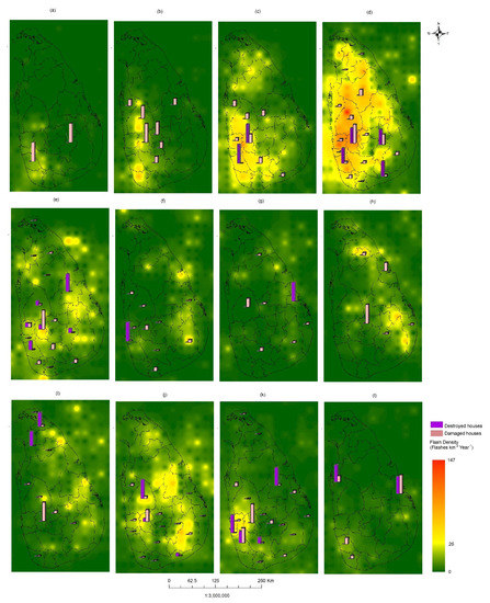 Variation of the lightning flash density with the recorded property damage (in %) in Sri Lanka, from 1974 to 2019, for all 12 months, presented district-wise: (a) January, (b) February, (c) March, (d) April, (e) May, (f) June, (g) July, (h) August, (i) September, (j) October, (k) November, and (l) December.