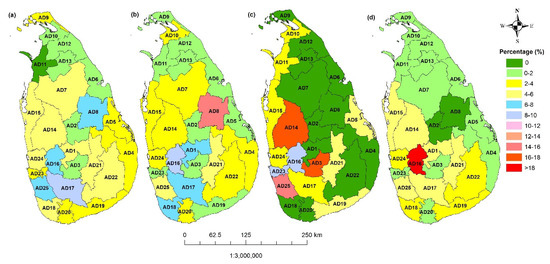 Figure 14a–d shows the district-wise percentage variation of the total lightning accidents reported in Sri Lanka from 1974 to 2019. It is a visual interpretation of the data summarized in Table 3. The administrative districts (ADs) in the western and southwestern regions in the country were more prone to lightning accidents than the ADs in the north and northeastern regions during the considered period.
