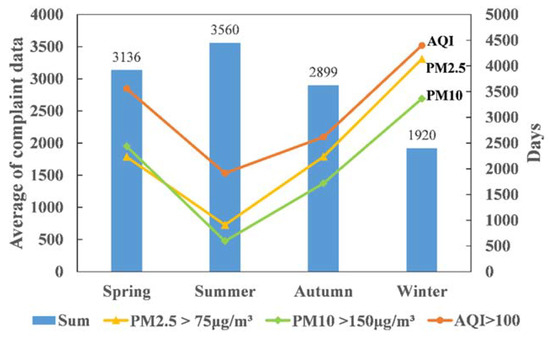 - The number and emotional intensity of public air pollution complaint data, which were −0.7 and −0.73, respectively, were negatively correlated with PM2.5. It means that the number of complaints is large when the air quality is good, but the public’s negative emotion is not strong. Moreover, the number of public complaints is reduced when the air quality deteriorates, and the negative emotion is stronger.