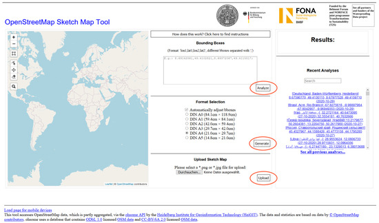 The Sketch Map Tool, as shown in Figure 1, is split into three main parts. It comprises a map in the left column, the main functionalities bounding box selection, analysis, sketch map generation and sketch map upload in the central column and the results section in the right column. After the successful completion of the requested task, a link leading to the elaborated analysis, the generated sketch map or the GeoTIFF file will be displayed in the upper right corner. Underneath, the results of previous analyses are listed so that older results can be reviewed again. The tool is supposed to be used as indicated by the workflow depicted in Figure 2.