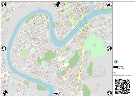 As a whole, the Sketch Map Tool unifies the aforementioned methods: A feature for analyzing the fitness of a selected region’s OSM data for usage in sketch maps, a sketch map generation function and a sketch map upload function (see Figure 1). It therefore substantially facilitates the sketch map usage process, especially by pointing out possible difficulties to be aware of during the process and by focusing on the comprehensibility for laypeople in all the steps (see Figure 2). Thus, it is an easy-to-use tool that can be applied by local stakeholders to allow them to gather themselves some information about previous flood events in a specific area. After having successfully completed the fitness analyses for a possible study area and deciding to use the sketch maps for data collection, the users can request the generation of a sketch map in a paper format they prefer, which will then be provided as a PDF document which also contains a QR Code [16] necessary for the automatic georeferencing and little globes, which frame the generated map to detect its boundaries. After applying a printout of this sketch map in the field, e.g., for marking flood risk perception, the users can use the upload functionality, which allows the creation of a GeoTIFF file from a photograph of the map. This file can be used for visualizations or further analyses in a GIS, for example.