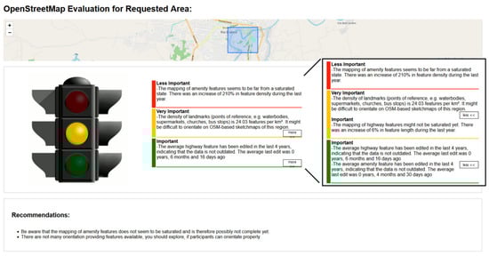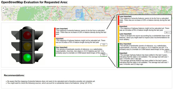 The OpenStreetMap History Database (OSHDB) [22] is a tool developed by the Heidelberg Institute for Geoinformation Technology (HeiGIT) that allows analyses of OSM data with a focus on analyzing the data’s evolution. It provides efficient storage and retrieval of OSM data for any available spatio-temporal extent [23]. The Ohsome API, which was developed by the HeiGIT as well, provides a convenient Application Programming Interface (API), to access an instance of the OSHDB and therefore enables the access of OSM data for a chosen spatio-temporal extent [24]. It also enables filtering and aggregation of the data. For example, it is possible to calculate the density of features with a certain tag (e.g., tourism = hotel). The analysis feature of the Sketch Map Tool uses the Ohsome API to access the OSM data for performing its quality analyses (see Section 3.4). The fitness of a study region’s OSM data for usage in sketch maps is evaluated based on an intrinsic quality analysis, examining both the recent state and the evolution of the OSM data. Users are given a general fitness score, to assess the overall fitness of a region’s OSM data as well as detailed reports about each analysis. Furthermore, recommendations on what to consider before and while using OSM-based sketch maps of this region are given.