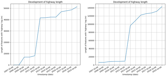 Development of the length of OSM features tagged with highway = * in the discussed study areas in Rio Branco (left) and São Paulo (right).