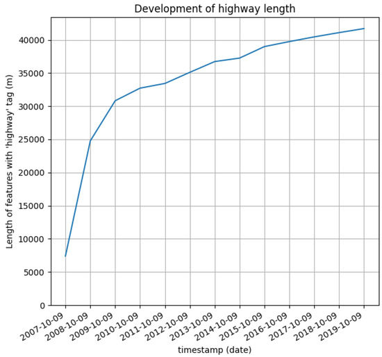 The generated visualizations of the analyses also enable more in-depth comparisons between different study areas. See Figure 7 and Figure 8 for an example comparing the development of highway feature length in the two discussed areas and the old town of Heidelberg. Although the development in Heidelberg with its decreasing growth suggests a state close to completion, this is not the case for Rio Branco and São Paulo, where the graphs have not flattened yet. A major increase in feature length can be found in all the analyzed areas, suggesting that no lack of data regarding highway features is present. These visualizations also point at the difficulty of this analysis: Both the highway features in Rio Branco and in São Paulo have experienced a phase with very little growth, which would have been interpreted as a state close to mapping completion. Conversely, there is less ambiguity when detecting relative growth above the mentioned thresholds, as this implies that there were some features not yet mapped and probably still are. It also must be considered that from this analysis it cannot be inferred, which kinds of highway features are still being added. The effect of incompletely mapped sidewalks (which can have a highway tag [39]), for example, is less problematic than that of incompletely mapped roads in residential areas. Generally, it is preferable that the mapping is close to a state of completion for highway features of all kinds, which is why the results of this analysis including the visualizations can still provide useful insights for the user despite the mentioned possible difficulties.