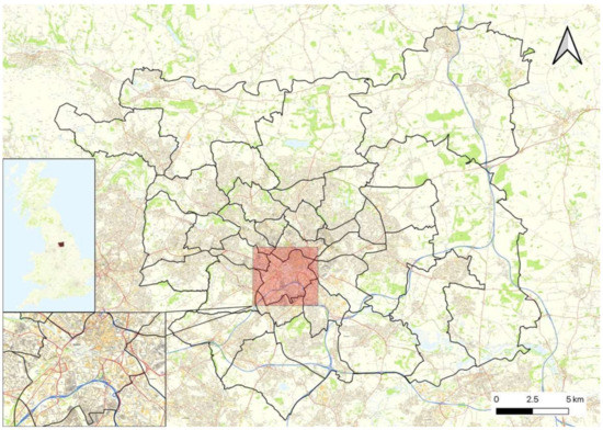 The study area, Leeds, United Kingdom. The inset maps highlight the focus area, the ward of City and Holbeck, which will be referred to as the city centre, in addition to the location of Leeds within the UK. The city centre covers an area of 4 km2.