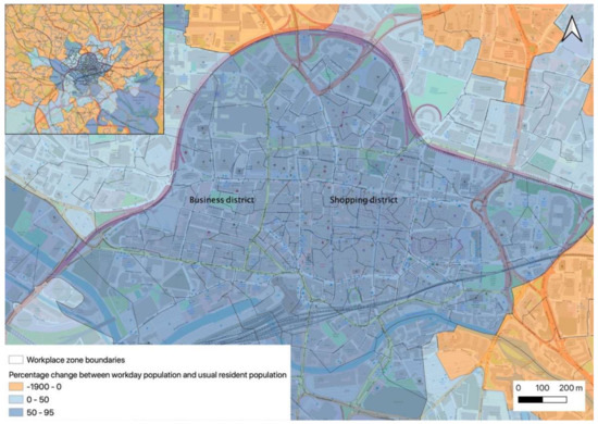 Figure 2 demonstrates the percentage change between workday population and usual resident population estimates from the UK 2011 Census which represent the population on the 27 March 2011. Areas which experience increases in the workday population (workplace zones shaded in blue) can be easily identified. The workplace zones which span the city centre, including the shopping and business districts experience an increase in population between 50 and 95%.